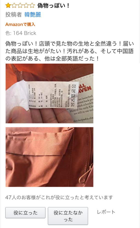返品や返金もできないで泣き寝入り状態になったり、安いといっても1万円支払って失敗するくらいなら最初からフェールラーベン正規取扱店で購入した方が絶対にいいです(´▽`*)安心です